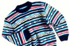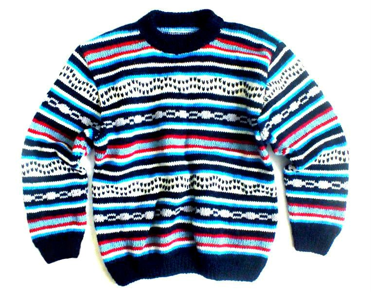 KRÁSNÝ VLNĚNÝ CHLAPECKÝ SVETR S BAREVNÝMI PROUŽKOVÝMI VZORY/ORNAMENTY, S PRUŽNÝMI NÁPLETY, RUČNÍ PRÁCE, DÉLKA 56 CM, OBVOD HRUDNÍKU 2 x 47 CM, DÉLKA RUKÁVŮ OD KRKU 67 CM, STAV: NOVÝ ![]()