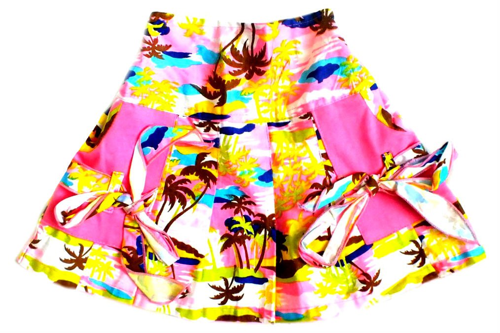 PĚKNÁ DÍVČÍ BAVLNĚNÁ SUKÝNKA S BAREVNÝM EXOTICKÝM VZORKEM, S KRÁSNÝMI KAPSIČKAMI, BOČNÍ DÉLKA 27 CM, PAS: GUMA, OBVOD PASU V KLIDU 2 x 20 CM (= 2 x 25 CM), PĚKNÝ STAV