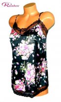 NÁDHERNÝ SATÉNOVÝ DÁMSKÝ TOP S ČERNOU NYLONOVOU KRAJKOU, SPOLEČENSKÝ / BĚŽNÉ NOŠENÍ, BARVA: ČERNÁ S KRÁSNÝM KVĚTINOVÝM VZOREM, S NASTAVITELNÝMI RAMÍNKY, VELMI PŘÍJEMNÝ A SPLÝVAVY. VOLNÝ STŘIH. CELKOVÁ DÉLKA 66 CM, OBVOD HRUDNÍKU 2 x 47 CM, STAV: NOVÝ ![]()