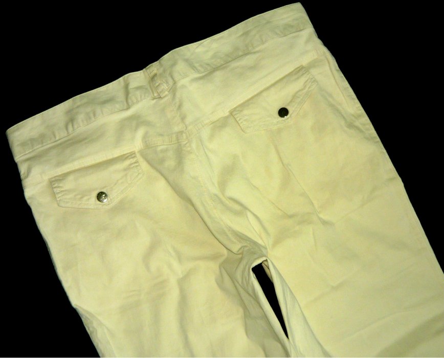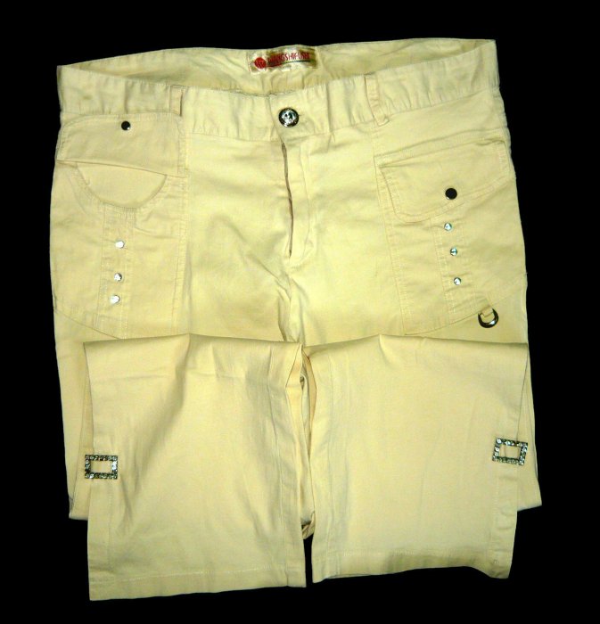 PĚKNÉ BÉŽOVÉ 7/8 DÁMSKÉ KALHOTY S ROZPARKEM NA NOHAVICÍCH CCA 10 CM, SE ZAPÍNÁNÍM NA ZIP A KNOFLÍČEK S BÍLÝM KAMÍNKEM, S KAPSAMI, S POUTKY NA PÁSEK NEBO STUHU, SLIM STŘIH. VELMI PŘÍJEMNÁ, PRODYŠNÁ A PRUŽNÁ LÁTKA (bavlna + elastan). CELKOVÁ DÉLKA 75 CM, OBVOD PASU V KLIDU 2 x 38 CM (= 2 x 40 CM), ROZKROK 54 CM, VEL. 38, PROSÍM MĚŘTE! PĚKNÝ STAV