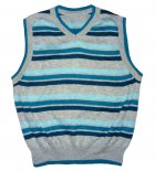 PĚKNÁ BAVLNĚNÁ CHLAPECKÁ VESTA V SVĚTLE ŠEDÉ BARVĚ S PROUŽKY, S NÁPLETY, VELMI PŘÍJEMNÁ STROJOVÁ PLETENINA, DÉLKA 46 CM, OBVOD HRUDNÍKU V KLIDU 2 x 36 CM, TOP STAV, BEZ ZNÁMEK NOŠENÍ ![]()
