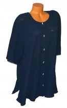 PĚKNÁ TMAVOMODRÁ DÁMSKÁ TUNIKA SE ZAPÍNÁNÍM VPŘEDU NA KNOFLÍČKY, S KRÁTKÝMI RUKÁVY, STŘIH DO ZVONU, S ROZPARKY PO STRANÁCH A VZADU CCA 11 CM, KRÁSNÁ MÍRNĚ PRŮSVITNÁ LÁTKA (POLYESTER), SPLÝVAVÁ, PRODYŠNÁ, NEPRUŽNÁ. DÉLKA 84 CM, OBVOD HRUDNÍKU 2 x 63 CM, VEL. XXL, PĚKNÝ STAV