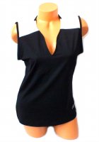 PĚKNÉ DÁMSKÉ SPORTOVNÍ TRIČKO V ČERNÉ BARVĚ S BÍLÝM PRVKEM, VPRAVO DOLE S REFLEXEM. KVALITNÍ, PRUŽNÁ A SPLÝVAVÁ LÁTKA (90 % polyamid + 10 % elastan). DÉLKA V KLIDU 62 CM, OBVOD HRUDNÍKU V KLIDU 2 x 50 CM, OBVOD PASU V KLIDU 2 x 44 CM, VEL. L/XL, PROSÍM MĚŘTE, TESCO, STAV: NOVÝ