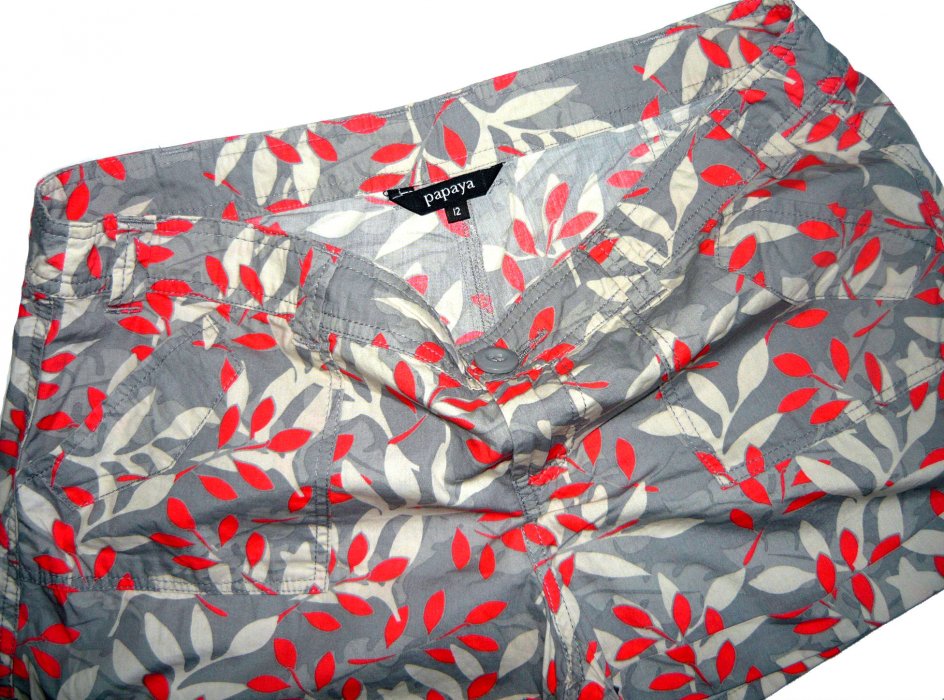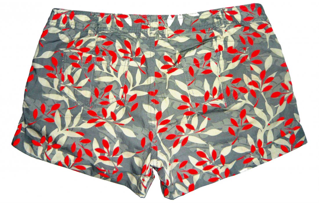 KRÁSNÉ DÁMSKÉ VZOROVANÉ ŠORTKY Z KVALITNÍ NEPRUŽNÉ BAVLNY, BARVA ŠEDÁ S KORÁLOVO-BÉŽOVÝMI VZORY, S KAPSAMI VPŘEDU, VZADU, SE ZAPÍNÁNÍM NA ZIP A KNOFLÍK. BOČNÍ DÉLKA 27 CM, OBVOD PASU 2 x 43 CM, ROZKROK 5 CM, VEL. M (UK 12, 40/42), MATALAN (PAPAYA), PĚKNÝ STAV